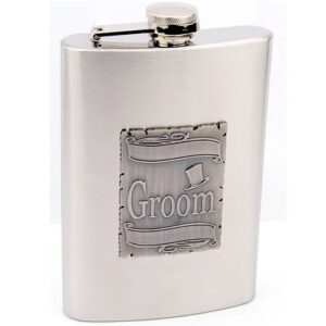8oz Wedding Flask for Groom with Metal Emblem made by Top Shelf Flasksô This genuine stainless steel 8oz flasks features a unique emblem made from Zinc that reads "Groom." This is a perfect gift for any groom at any wedding. The high quality materials combined with the uniqueness will make these gifts a special part...